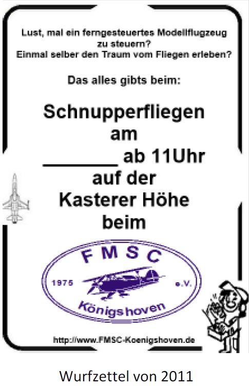 Das Thema Schnupperfliegen wurde nochmal aufgegriffen. Wurfzettel und Plakate wurden im Stadtgebiet Bedburg verteilt. Die Aktion war ein voller Erfolg. Die Resonanz in der Bevölkerung war so groß, dass ein zweiter Termin angesetzt wurde. Als Ergebnis waren einige Neuanmeldungen zu verzeichnen.